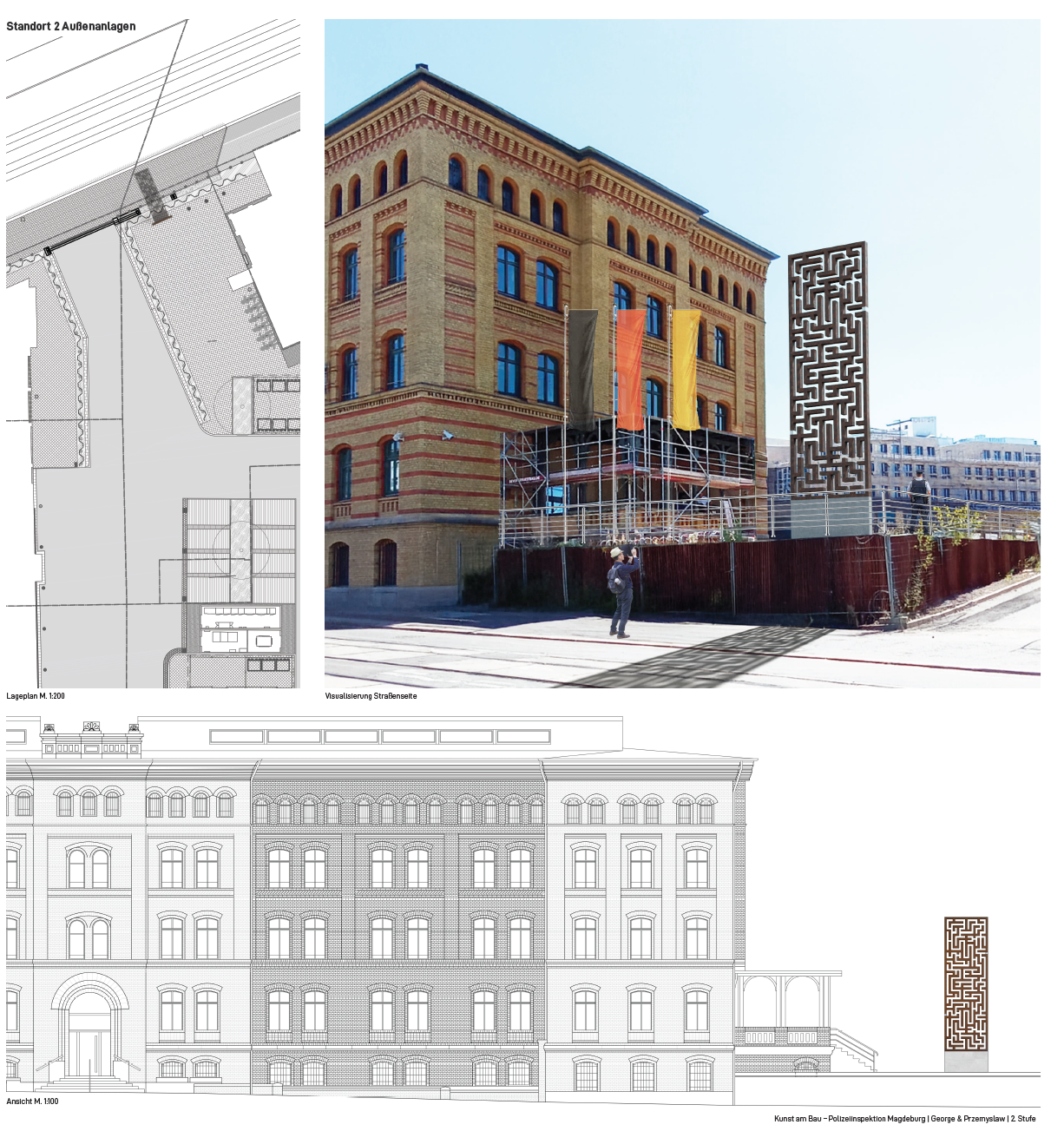 Das Kunstwerk ist für den Standort 2 – Außenanlagen, bevorzugt im Bereich 2.1 vorgesehen. Das ursprünglich geplante Pflanzbeet entfällt, um die Skulptur als klaren Solitär im Raum zu setzen. Ihre Position gewährleistet Sichtbezüge von innen und außen, ohne Wegeführungen, Kameras oder die Einsatzlogistik zu beeinträchtigen. Eine Stromanbindung ist nicht erforderlich.